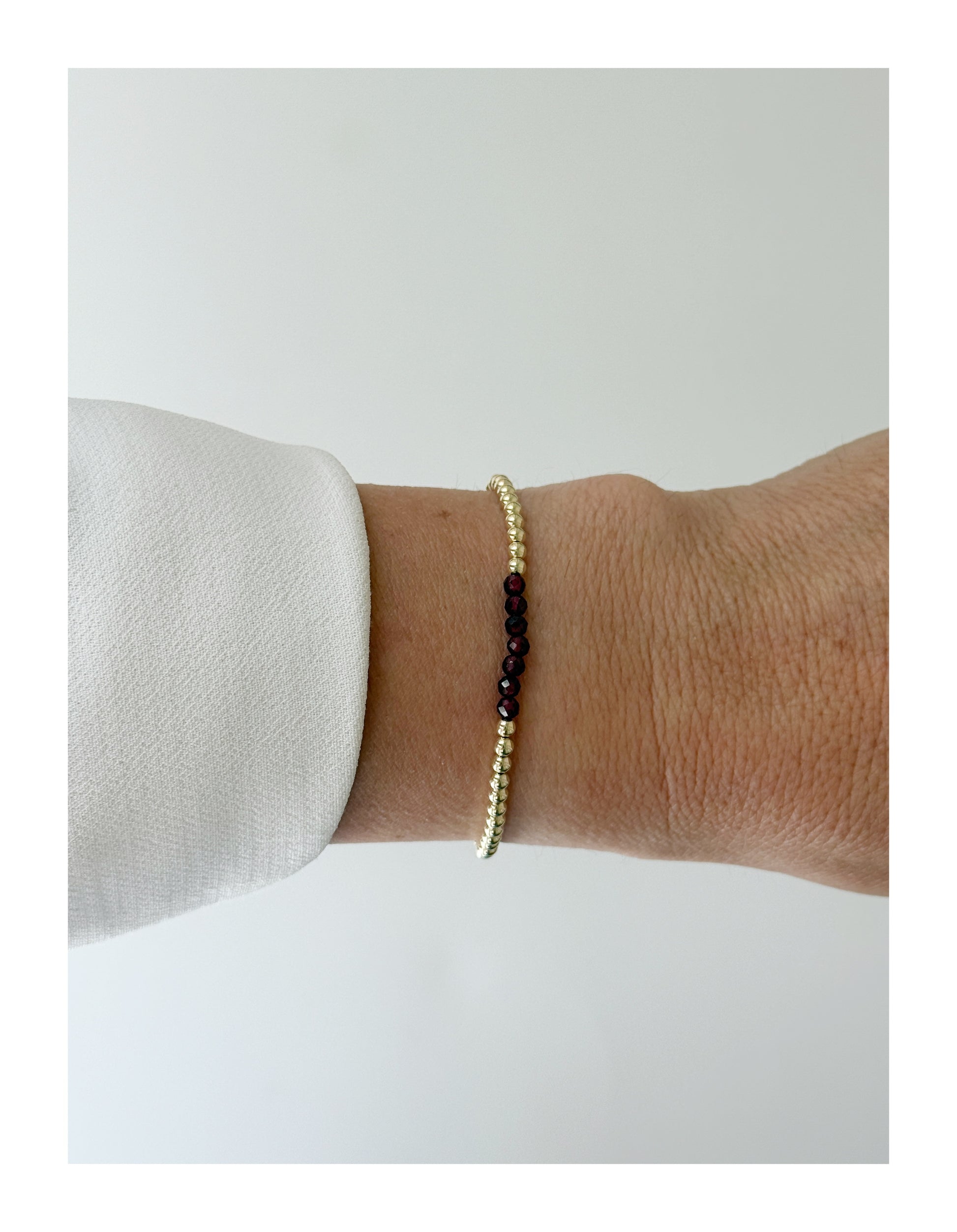 Our Goldie bracelet, finished with a whisper of deep garnet. A touch of color that speaks volumes. Elegant, refined, and rich with quiet intensity. Perfect for the woman who appreciates subtle luxury with a hint of depth.