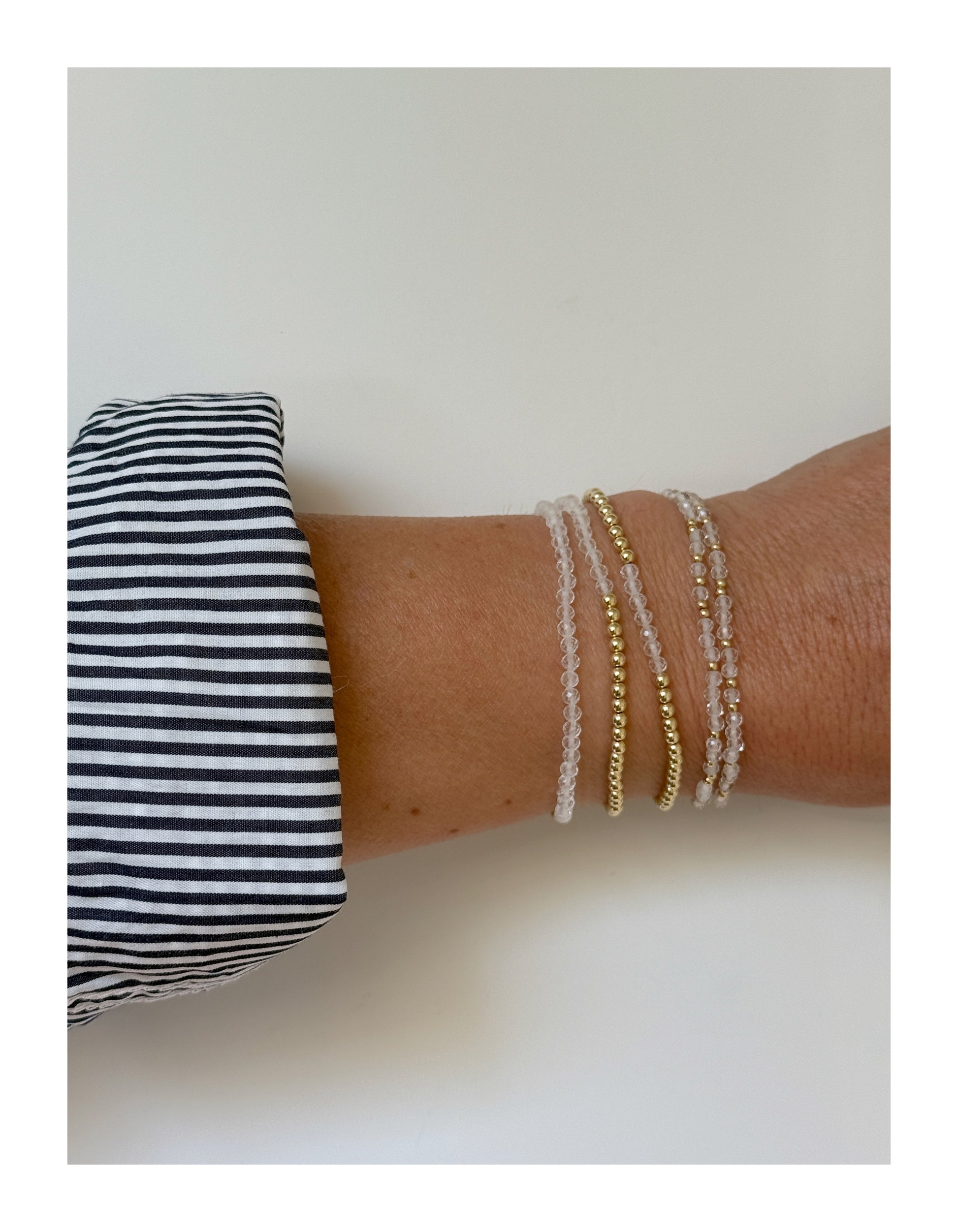 A modern study in light and clarity. Clear quartz amplifies energy and intention, bringing focus and alignment to your day. Paired with gold, this stack feels clean, refined, and effortlessly radiant.